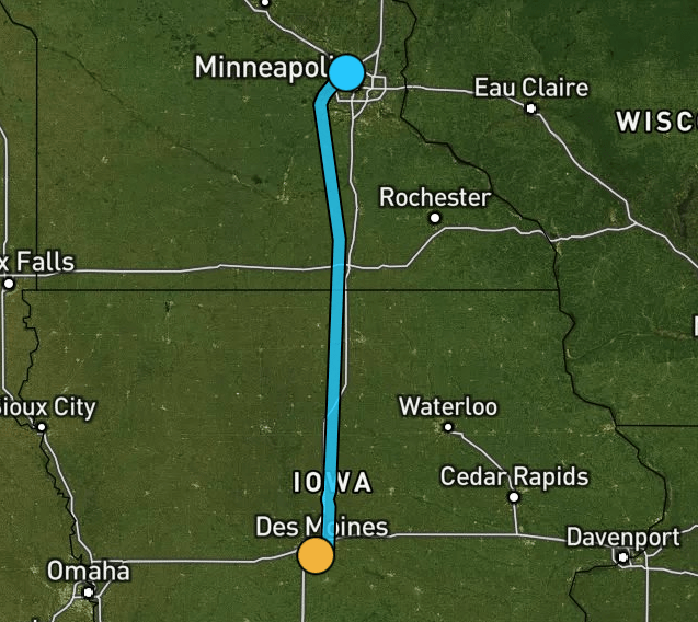 We left Crystal (KMIC) at approximately 4:30pm. Clear blue skies and calm wind really helped make it in a smooth and enjoyable trip. Although Des Moines is straight south of Crystal, I had to detour around to ensure I stayed out of Minneapolis and Flying Cloud airspace. Minneapolis has Class B airspace and Flying Cloud has Class D airspace. Although I would have been able to get permission to transition via the Class D airspace, I just preferred to fly without troubling them since it would only add 1-2 minutes to my flight by making the detour.