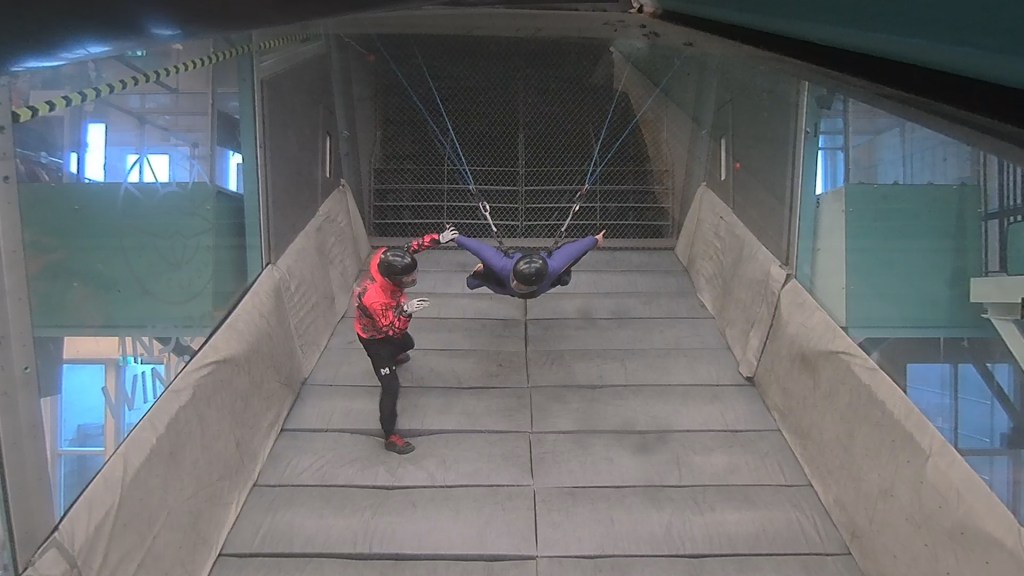 After moving on from the 4-point harness, the instructor held me on a leash. This ensured that he can still have some control if I kept flying off the center and I don’t hurt myself. The training between the harness and the leash primarily involved being safe in the tunnel where a student can get seriously injured if they crash into the walls at high speed.