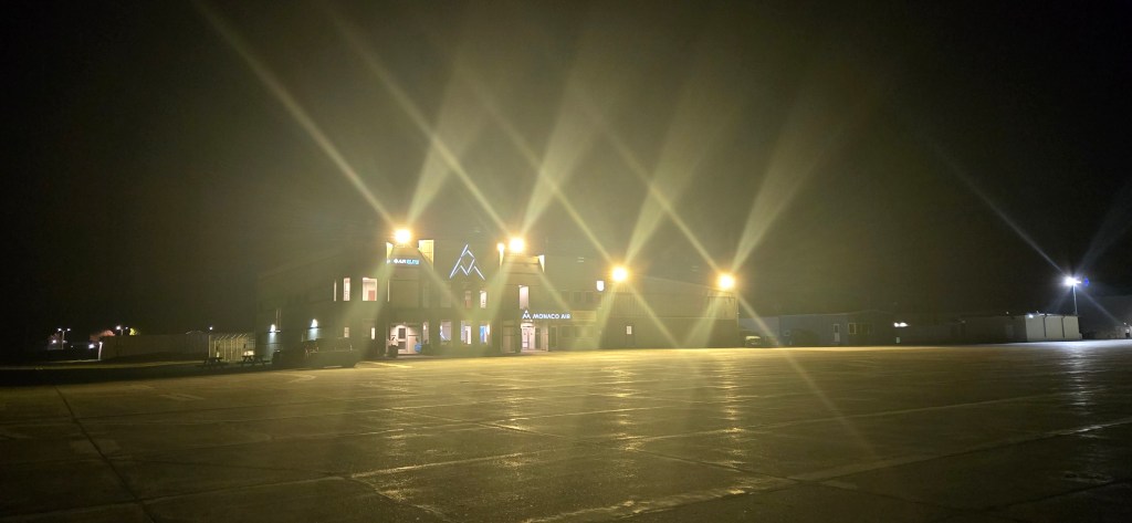 After a delightful time in Grand Marais, we returned to the airport. By the time we arrived, it was dark. On our return flight to Crystal, we noticed that the tailwind we enjoyed on the way up had shifted into a strong headwind.